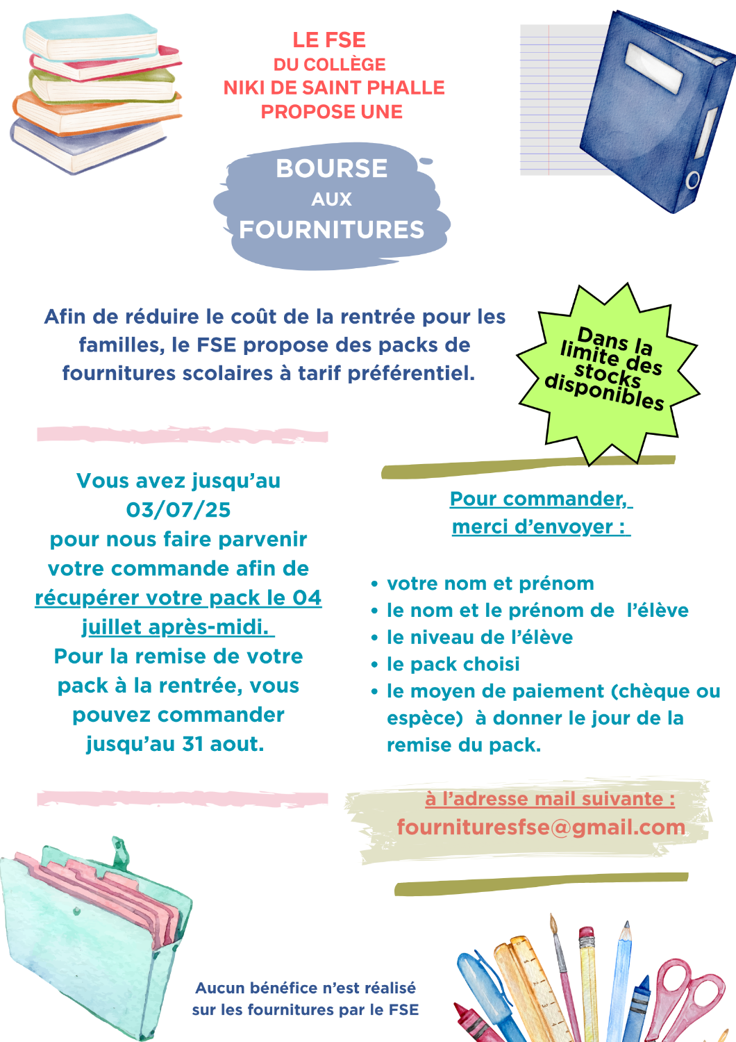 Le Foyer Socio-Educatif du collège vous propose, en quantités limitées, d’accéder à des packs de fournitures scolaires pour la rentrée à tarifs compétitifs.